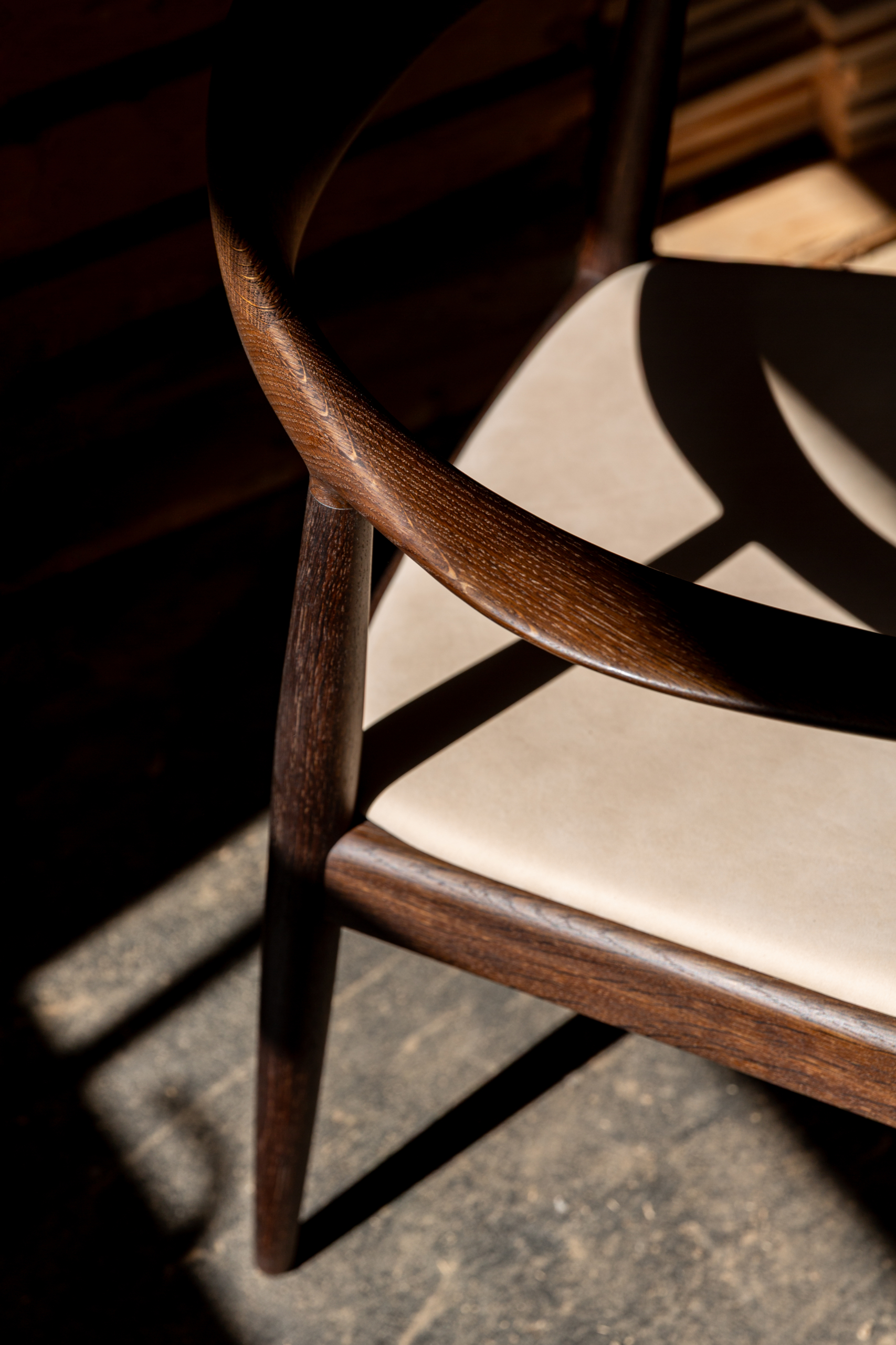 Each of the ten chairs has been produced in our workshop in Allerød using traditional methods that honour Wegner’s original intentions. The smoked oak brings a deep natural tone, while the nubuck leather adds a refined tactility that underscores the precision of the construction.
